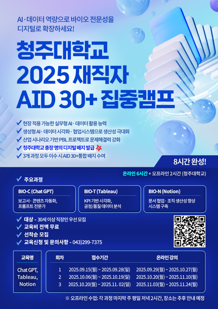 청주대학교 '2025 재직자 AID 30+ 집중캠프' 교육생 모집 안내