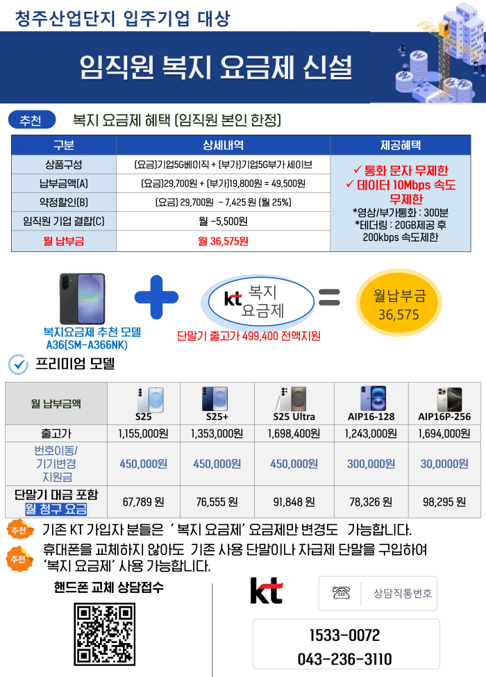 청주산업단지 입주기업 대상 'KT 임직원 복지 요금제' 신설 안내