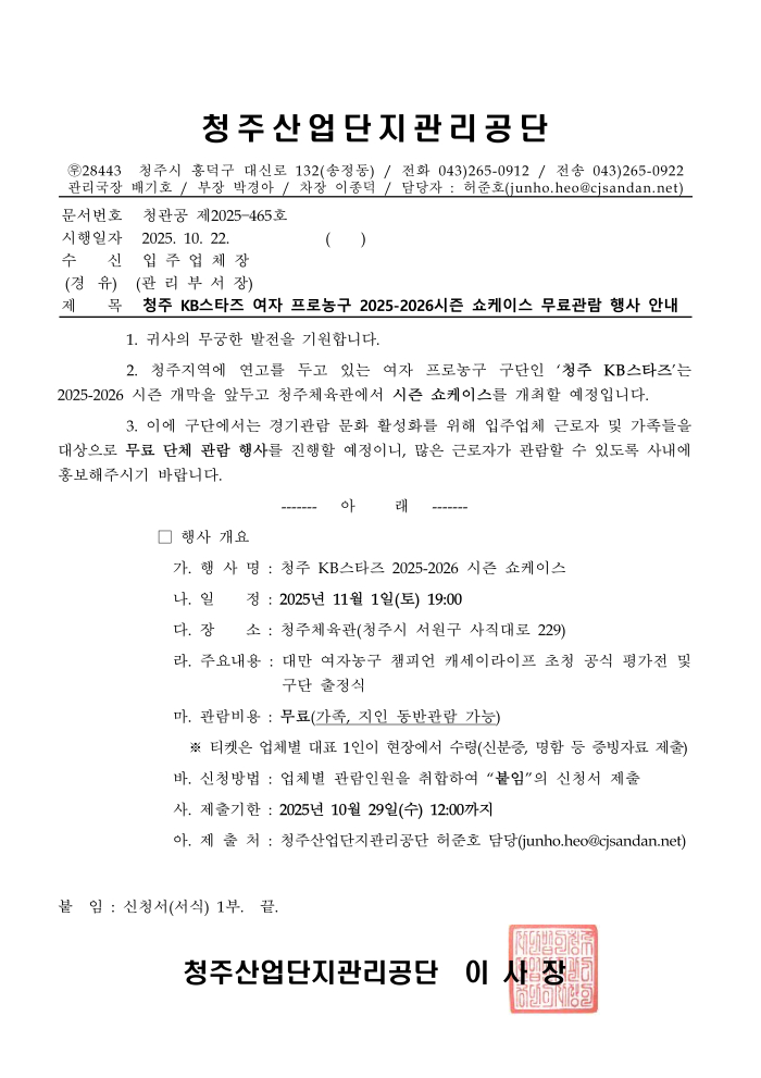 청주 KB스타즈 여자 프로농구 2025-2026시즌 쇼케이스 무료관람 행사 안내