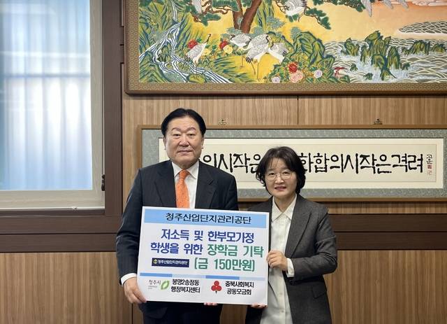 충북 청주산업단지관리공단(이사장 현일선)은 12일 지역 내 저소득가정 학생에게 전달해달라며 장학금 150만원을 청주시 흥덕구 봉명2송정동 행정복지센터에 기탁했다.