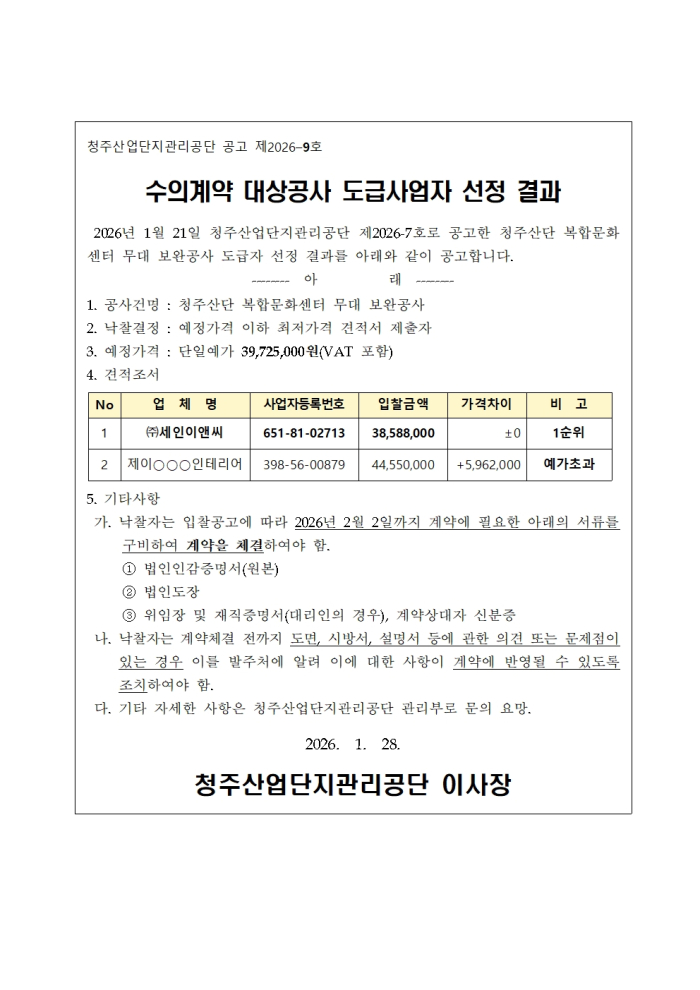 (공고) 수의계약 대상공사 도급사업자 선정결과(복합문화센터 무대 및 조명보완공사)